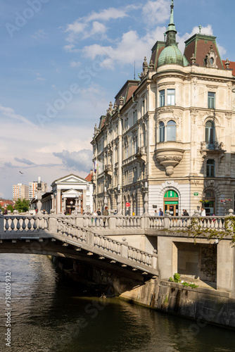 Naklejka premium Ljubljana, Slovenia; triple Bridge Tromostovje and beautiful old building, Ljublianica river.