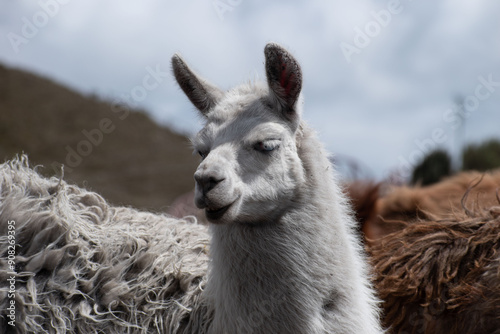 Obraz premium Llama (Alpaca) blanca en la montaña, fondo de cielo con nubes, retrato, rostro, Ecuador