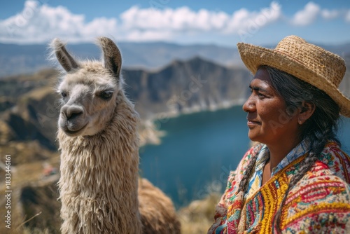© Sandu, Fototapeta premium Llama and Local Woman Overlooking Scenic Andes