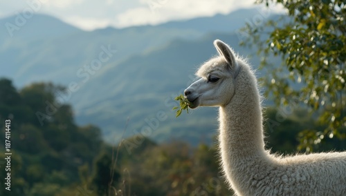 Fototapeta premium Llama feeding on lush green leaves, highlighting forage intake and grazing...