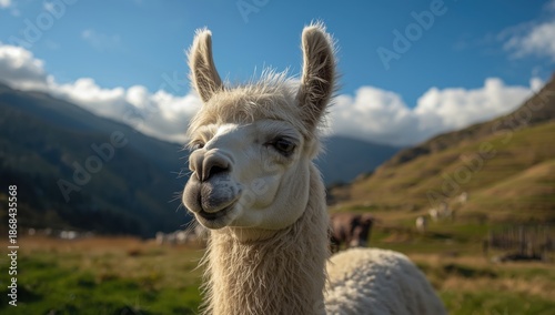 © VolumeThings, Fototapeta premium Llama grazing in a field in Peru