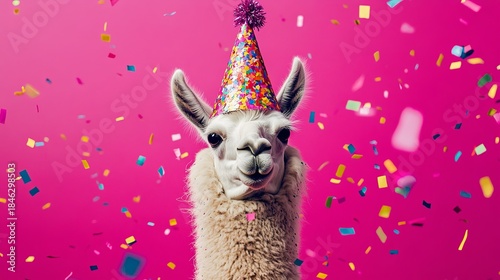 Fototapeta premium Llama in a party hat covered with colorful confetti, surrounded by bright pink tones. .