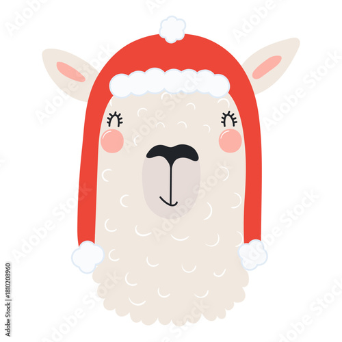 © Maria Skrigan, Naklejka premium Llama in a Santa Claus hat isolated on transparent. Hand drawn flat vector illustration. Cute cartoon character. Traditional Christmas, New Year, seasonal design element, holiday clip art
