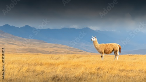 © Yopi, Fototapeta premium Llama in Golden Grassland Under Dramatic Sky with Mountain Background