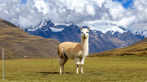 Naklejka premium Llama in high altitude meadow with mountain view