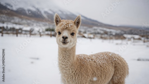 © Sona, Fototapeta premium Llama in snowy landscape with mountains and fences, winter scene, fluffy coat.