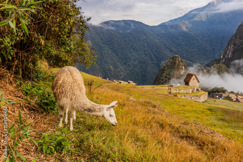 © Matyas Rehak, Obraz premium Llama (Lama glama) at the terraces of Machu Picchu ruins, Peru
