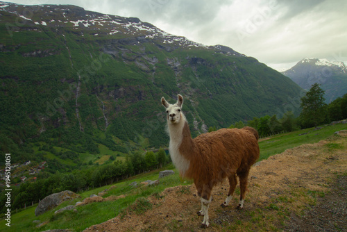 © Aliaksei, Obraz premium Llama Looking at Camera with Scenic Geirangerfjord Background in Norway
