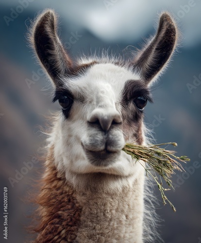 © 豆豆 胡, Obraz premium Llama Portrait with Grass in Mouth