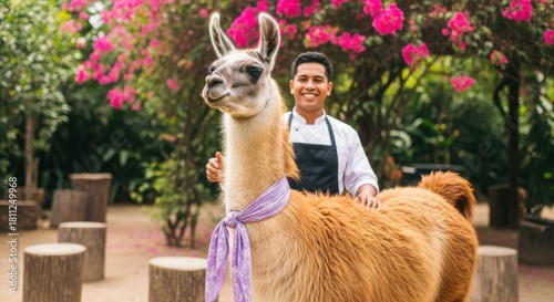 © Yana, Obraz premium Llama posing with a smiling caretaker in a vibrant garden vibrant with blooming flowers and wooden seating