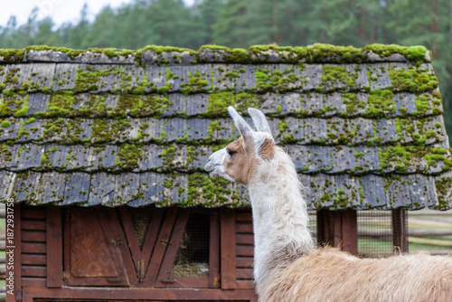 © Jorens, Fototapeta premium Llama profile standing by mossy wooden shed