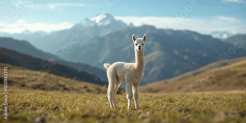 © AkuAku, Obraz premium Llama resting on rugged landscape in Bolivia, emphasizing animal resilience