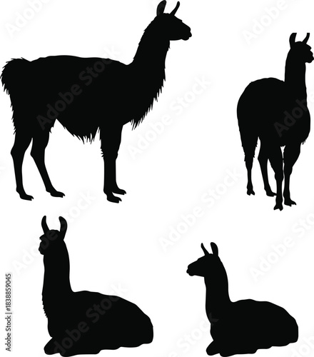 Obraz premium Llama silhouette vector, standing and lying poses, wild animal clipart, black...