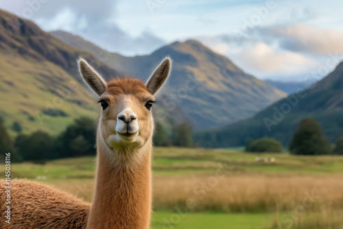 Obraz premium Llama standing in a serene pasture with mountains in the background during...