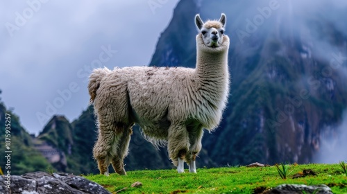© muryor, Fototapeta premium Llama Standing on Green Grass in Mountain Landscape with Dramatic Sky
