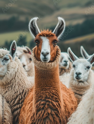© Andrew Hudson, Obraz premium Llama Standing Out Among Sheep in Field - Generative AI