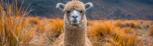 © kramynina, Obraz premium Llama that is standing in the tall grass, animal background, banner, copy space