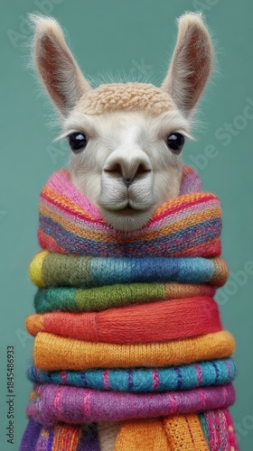 Fototapeta premium Llama wearing colorful scarves standing against a green background during...