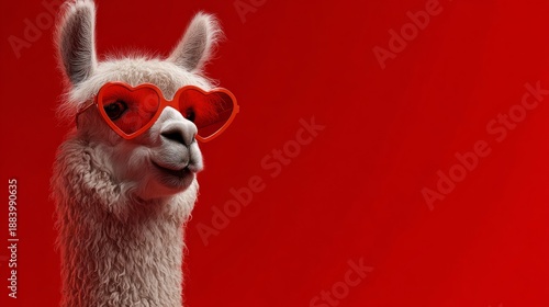 © Tatiana, Obraz premium Llama wearing red heart sunglasses on red background, copy space