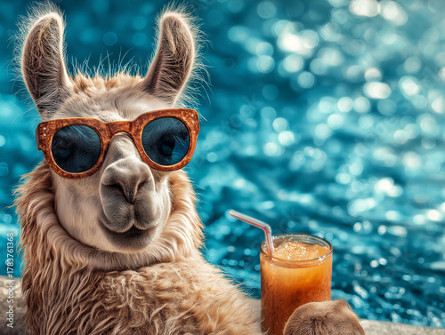 Obraz premium Llama wearing sunglasses relaxes by the poolside. A glass of orange juice...