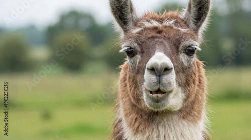 Fototapeta premium Llama with a puzzled look in a green field