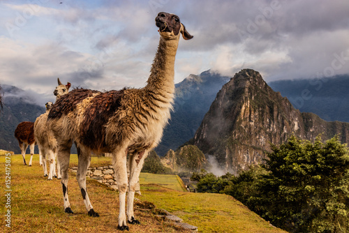 © Matyas Rehak, Obraz premium Llamas (Lama glama) at the terraces of Machu Picchu ruins, Peru