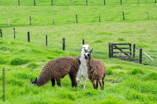 © Stock Latino, Naklejka premium Llamas standing and grazing in a vibrant green meadow