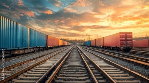Fototapeta premium Loading freight containers onto railway wagons transportation hub industrial...