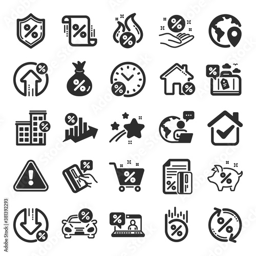 © blankstock, Naklejka premium Loan icons. Set of Investment, Interest rate and Percentage diagram icons. Car leasing, analytics plan, Credit card percent and loan rate. Bank mortgage, leasing, interest graph. Flat icon set. Vector