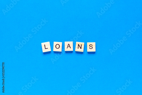 Obraz premium loans inscription in wooden letters on a blue background, flat layout, top...