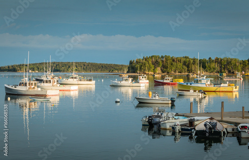 © rabbitti, Obraz premium Lobster boats are moored in the harbor at dusk in Friendship, Maine