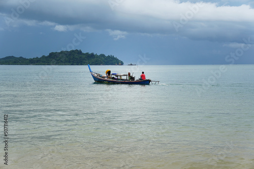Fototapeta premium Local Asian fisherman boat on the sea with low floating clouds.