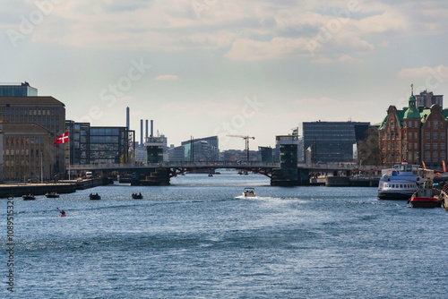 Naklejka premium Local people riding bicycles on Knippelsbro Knippel bascule bridge across the Inner Harbour on Christianshavn, Copenhagen, Denmark