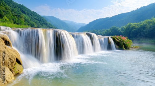 © Sirada, Fototapeta premium Located in a remote area, the waterfall in Luoping, China cascades down a series of jagged rocks, creating a mesmerizing display of force and beauty