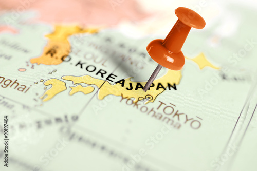 © Zerophoto, Fototapeta premium Location Japan. Red pin on the map.