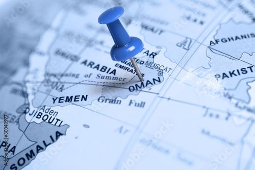 © Zerophoto, Naklejka premium Location Oman. Blue pin on the map.
