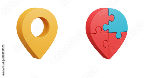 Fototapeta premium Location Pin Icons: 3D Map Pointer with Jigsaw Puzzle Concept