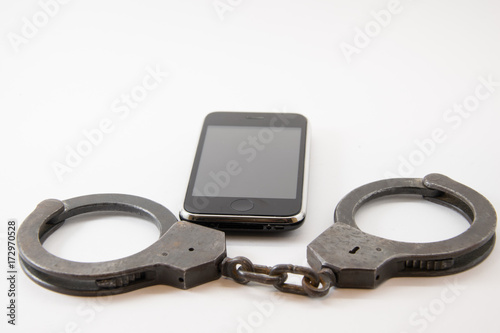 Obraz premium locked phone. phone locked with handcuffs on white background