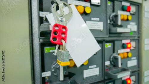 Fototapeta premium Lockout Tagout or LOTO. A key used to disconnect the energy system to ensure...