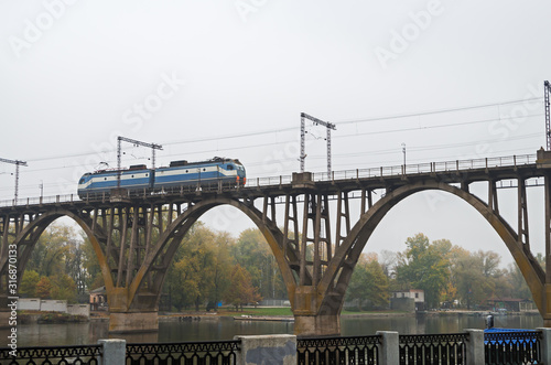 © batya, Obraz premium Locomotive moves along railroad arch bridge