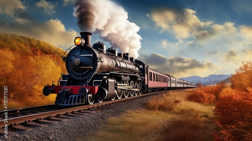 © adha, Obraz premium Locomotive. Steam train with white smoke. Steam train on railway track. antique steam train