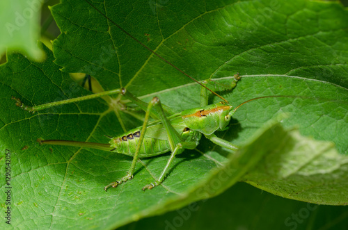 © alexey351, Fototapeta premium Locusts on green a leaf.