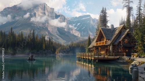 Naklejka premium Lodge Resort. Alpine Cabin at Emerald Lake in Canadian Mountains