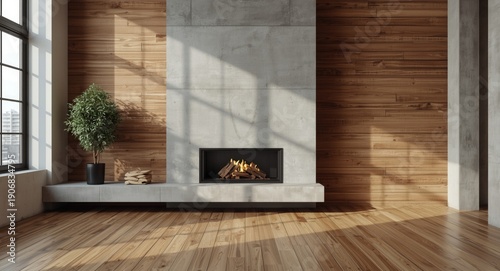 © AbstractAI, Fototapeta premium Loft living room design with fireplace concrete and wooden wall textures natural light from windows
