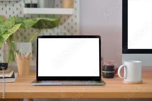 Fototapeta premium Loft wood office desk table with laptop, poster, coffee mug and supplies.