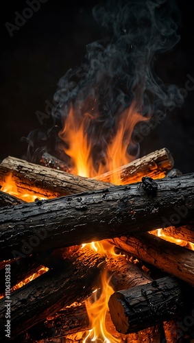 Naklejka premium Log burning with intense orange flames in dark smoky surroundings.