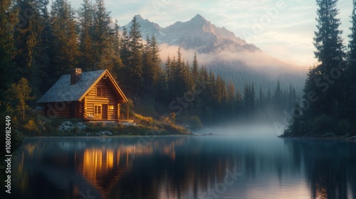 © ArtBox, Fototapeta premium Log cabin by secluded lake