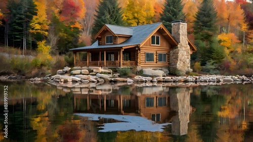 © Abraham, Obraz premium Log cabin by the lake in the woods water reflections