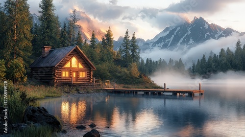 © Philipp, Fototapeta premium Log cabin glows by serene lake with mountains. Symbolizing tranquil retreats. Ideal for travel, real estate, vacation rentals, or remote workspaces visuals.