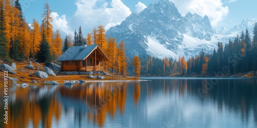 Fototapeta premium Log Cabin Nestled in a Mountain Lake Setting